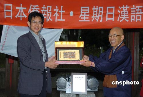11月9日,日本僑報社創辦的星期日漢語角在東京西池袋公園舉行第65次交流會。會上舉行了第2屆小島康譽國際貢獻獎頒獎儀式。著名日中友好人士小島康譽向為促進日中民間交流作出貢獻的《日本僑報》總編輯、漢語角創辦人段躍中頒發了一幅以中國新疆尼雅遺址出土的東漢“五星出東方利中國”古錦為原型的金箔藝術品和100萬日元。中國駐日使館友好交流參贊孫美嬌和中日兩國媒體、經濟界、友好團體及旅日留學生代表等約80人出席了當天的頒獎儀式。中新社發 日本僑報社 攝