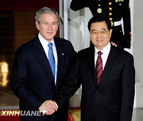 11月14日,美國總統(tǒng)布什在白宮為出席二十國集團(tuán)領(lǐng)導(dǎo)人金融市場和世界經(jīng)濟(jì)峰會的領(lǐng)導(dǎo)人舉行招待晚宴。這是晚宴前,美國總統(tǒng)布什在白宮迎接中國國家主席胡錦濤。新華社記者 張巖攝