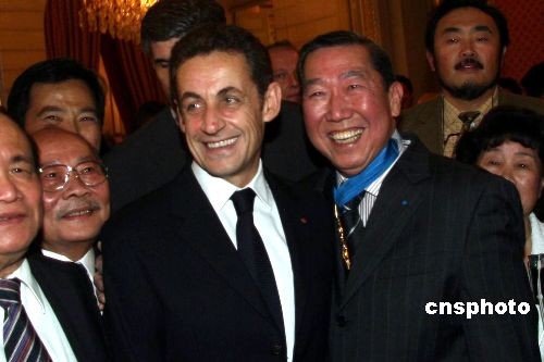 當(dāng)?shù)貢r(shí)間12月18日晚,法國(guó)總統(tǒng)薩科齊在總統(tǒng)府愛麗舍宮為旅法華人何福基先生(右)頒授司令級(jí) “法國(guó)榮譽(yù)軍團(tuán)勛章”。薩科齊稱贊何;灶B強(qiáng)的奮斗精神,在法國(guó)取得了很大的成功,多年來不忘參與法國(guó)當(dāng)?shù)氐恼紊詈凸婊顒?dòng)。中新社發(fā) 蘇宜 攝