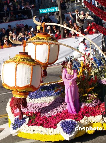 當(dāng)?shù)貢r(shí)間1月1日,第120屆美國帕薩迪娜玫瑰花車游行拉開2009新年序幕。游行隊(duì)伍由90個(gè)方陣組成,包括46輛花車、22支軍樂隊(duì)、18支騎術(shù)隊(duì)和5輛禮賓車,美輪美奐,精彩紛呈。臺灣中華航空公司的玫瑰花車“火鳳凰”,在花車游行中勇奪國際大獎(jiǎng)。該花車名為“臺灣燈會(huì)”,花車上凸顯中國燈籠和“仙女下凡”,奪人眼球。中新社發(fā) 盧威 攝
