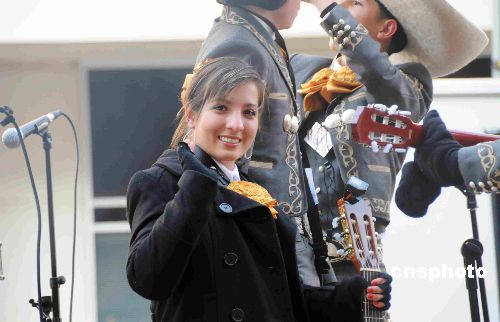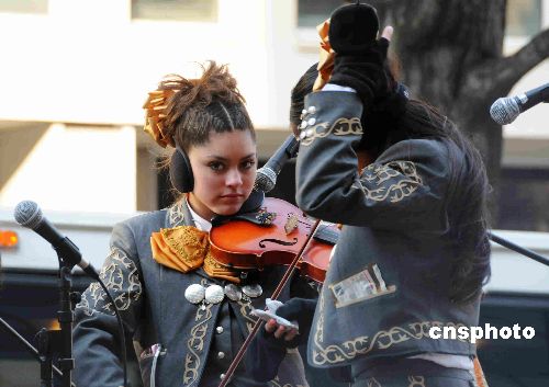 美國東部時間1月20日中午11點30分,美國第44任總統奧巴馬在國會山前宣誓就職。下午,官方組織的一場游行在著名的華盛頓賓夕法尼亞大街舉行。圖為奧巴馬就職日游行隊伍中的拉提琴的美少女。中新社發(fā) 邱江波 攝
