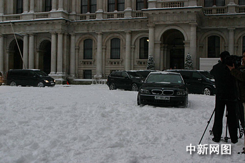 當(dāng)?shù)貢r(shí)間二月二日上午八時(shí)三十分許,中國(guó)總理溫家寶在英國(guó)倫敦出席布朗首相舉行的歡迎儀式。圖為溫家寶的座車(chē)駛?cè)胗?guó)外交部?jī)?nèi)庭院歡迎儀式現(xiàn)場(chǎng)。前夜,倫敦突然迎來(lái)近十七年最大的一場(chǎng)降雪,整座城市被白雪覆蓋。中新社記者 張朔 攝
