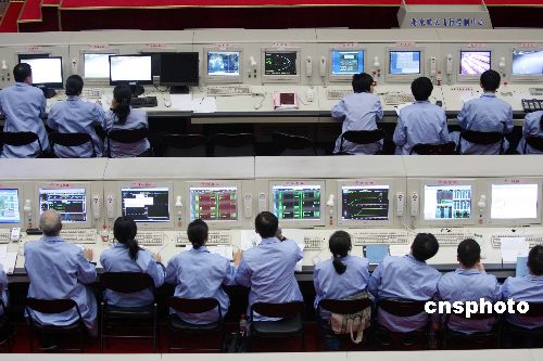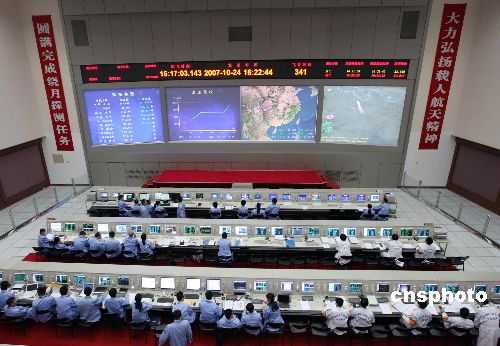 十月二十四日下午,北京航天飛行控制中心工作人員在做嫦娥一號衛星發射前的最后準備。中國首顆月球探測衛星——嫦娥一號發射工作已經準備就緒,計劃于當日十八點零五分發射。中新社發 毛建軍 攝
