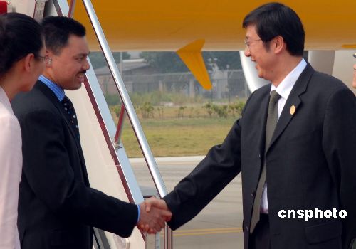 十月二十六日下午,文萊王儲比拉(左二)飛抵廣西南寧市,出席將于十月二十八日開幕的第四屆中國—東盟博覽會。圖為文萊王儲比拉在南寧國際機場受到廣西自治區黨委宣傳部長沈北海等廣西官員的歡迎。中新社發 蔣雪林 攝