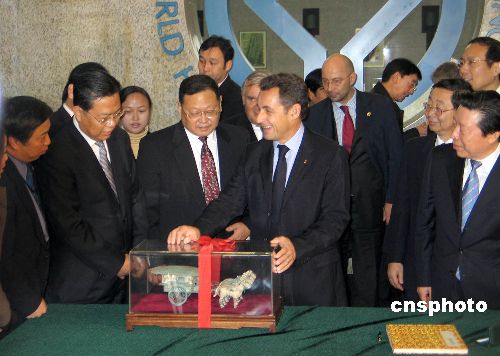 圖為法國總統薩科齊參觀秦始皇兵馬俑博物館時,接受館方贈送的銅車馬復制品。