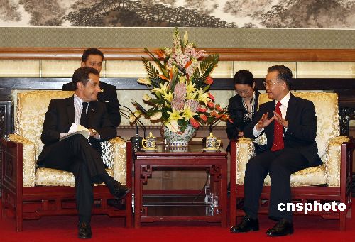 十一月二十六日,中國國務院總理溫家寶在北京釣魚臺國賓館會見來訪的法國總統薩科奇。中新社發 盛佳鵬 攝