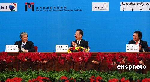 十一月二十八日,第四屆中歐工商峰會在北京人民大會堂閉幕。中國國務院總理溫家寶、歐盟輪值主席國葡萄牙總理蘇格拉底(左)與歐盟委員會主席巴羅佐(右)共同出席閉幕式。中新社發 廖文靜 攝