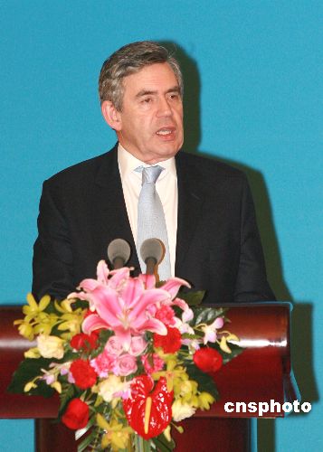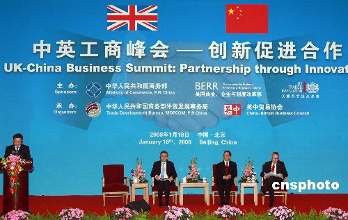 一月十八日,中國國務院總理溫家寶在北京人民大會堂與英國首相布朗共同出席中英工商峰會。中新社發 廖文靜 攝