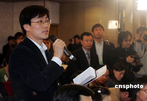 在北京人民大會堂舉行的全國政協十一屆一次會議首場新聞發布會上,中新社記者徐長安向大會新聞發言人吳建民提問。中新社發 潘索菲 攝