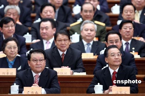 3月3日下午,全國政協十一屆一次會議在北京人民大會堂開幕,中共中央政治局常委、國務院總理溫家寶,中共中央政治局常委李長春出席。中新社發 盛佳鵬 攝