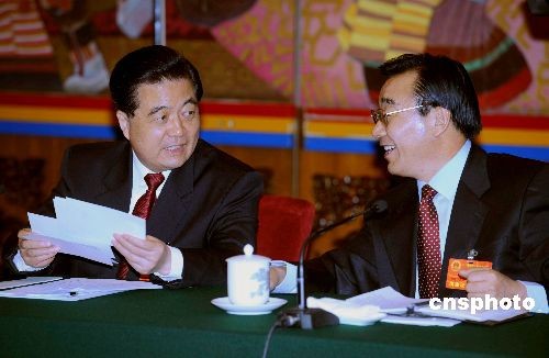 3月6日,中共中央總書記、國家主席胡錦濤,在北京人民大會堂與出席十一屆全國人大一次會議的西藏代表共同審議《政府工作報告》。圖為胡錦濤與全國人大代表、西藏自治區黨委書記張慶黎交談。中新社發 旦增 攝