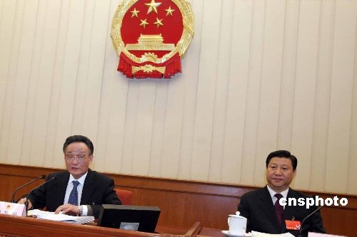 3月11日,十一屆全國人大一次會議主席團在北京舉行第二次會議,吳邦國主持會議,習近平出席。中新社發(fā) 任晨鳴 攝