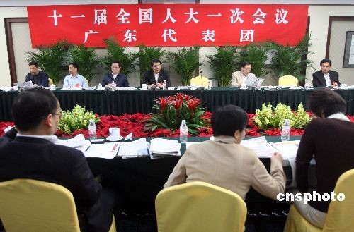 3月12日,參加十一屆全國人大一次會議的廣東代表團舉行小組會議,審議國務院機構改革方案。中新社發 張宇 攝