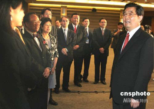 4月12日下午,國家主席胡錦濤在海南省博鰲專門會見出席博鰲亞洲論壇2008年會的香港、澳門企業家,并向大家表示問候。中新社發 任晨鳴 攝
