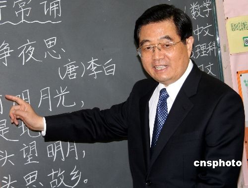 5月9日下午,正在日本訪問的中國國家主席胡錦濤前往橫濱中華山手學校參觀,并觀摩了該校小學三年級同學的語文課。在課上,胡錦濤主席饒有興致地走上講臺,給同學們講解唐詩《靜夜思》。中新社發 齊彬 攝