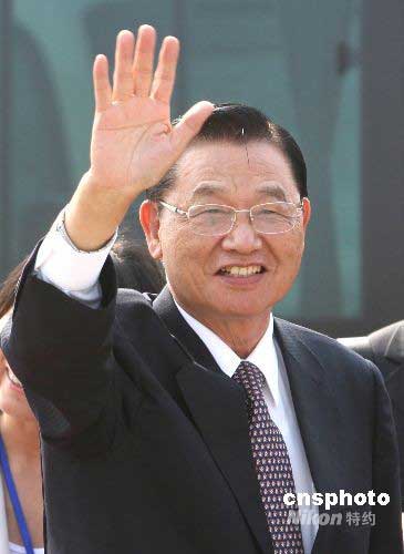 十一日下午三時十五分許,臺灣海峽交流基金會董事長江丙坤率海基會代表團抵達北京首都機場,向在場的中外媒體揮手致意。中新社發 趙振清 攝
