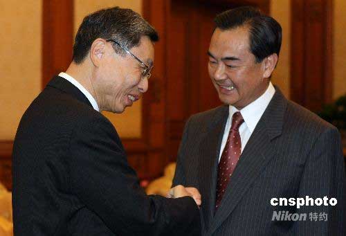 6月12日晚,新任中臺辦、國臺辦主任王毅(右)在北京釣魚臺會見并宴請臺灣海峽交流基金會董事長江丙坤一行。會見時,王毅與海基會副董事長高孔廉親切交談。中新社發(fā) 任晨鳴 攝