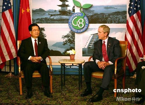 正在日本北海道出席八國集團同發展中國家領導人對話會的中國國家主席胡錦濤,當地時間7月9日下午會見美國總統布什,雙方就中美關系和其他共同關心的問題深入交換了意見。布什還表示,希望得到美國和中國的奧運會籃球比賽的門票。他笑著對胡錦濤說:“如果您能幫我搞到票的話,我將非常感激。” 中新社發 張朔 攝