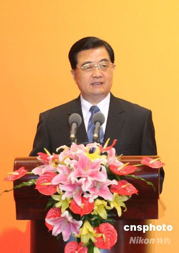 9月17日,中國國家主席胡錦濤與夫人劉永清在北京釣魚臺國賓館芳菲苑舉行宴會歡迎出席北京殘奧會閉幕式的國際貴賓。圖為胡錦濤在宴會上致辭。 中新社發 廖文靜 攝