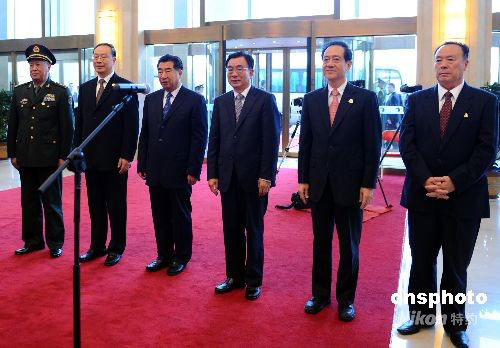 9月23日,中央代表團團長賀國強(右三)、副團長回良玉(左三)、韓啟德(右二)、杜青林(左二)、白立忱(右一)、陳炳德(左一)出席寧夏回族自治區(qū)成立50周年相關(guān)活動。中新社發(fā) 廖攀 攝