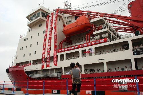 九月二十四日,搭乘著中國第三次北極科考隊的“雪龍”號極地破冰船凱旋“回家”,停泊在上海浦東外高橋碼頭。此次出征歷時兩個多月,航程超過萬余海里。中新社發 陸從兵 攝