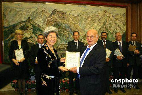 當(dāng)?shù)貢r間9月25日晚,中國駐英使館舉行國慶59周年招待會。圖為中國駐英大使傅瑩(左)在招待會上向英外交部、國際發(fā)展部、英中貿(mào)協(xié)等機(jī)構(gòu)代表及個人頒發(fā)中國民政部四川地震捐贈證書。中新社發(fā) 李鵬 攝