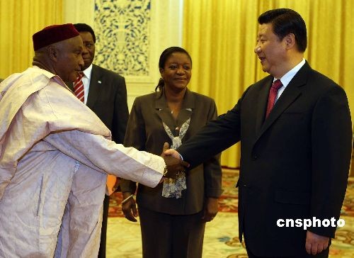 11月6日下午,中國國家副主席習近平在北京人民大會堂會見塞拉利昂外交部部長扎伊娜卜·哈瓦·班古拉(中)一行。中新社發 任晨鳴 攝