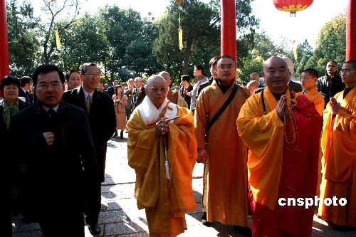 11月11日,日本奈良市長藤原昭、唐招提寺長老松浦俊海率友好代表團一行,在揚州市領導陪同下拜訪揚州大明寺并舉行鑒真大和尚追思會。大明寺能修大師率兩序大眾在山門親自迎接,并舉行了隆重的歡迎儀式。中新社發 崔佳明 攝
