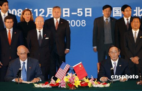 12月4日,在第五次中美戰(zhàn)略經(jīng)濟(jì)對(duì)話期間,中美能源環(huán)境十年合作框架下綠色合作伙伴計(jì)劃的相關(guān)簽字儀式在北京釣魚臺(tái)國(guó)賓館舉行。中國(guó)國(guó)務(wù)院副總理王岐山與美國(guó)財(cái)政部長(zhǎng)保爾森分別代表中美兩國(guó)政府簽署了《中美能源環(huán)境十年合作框架下的綠色合作伙伴計(jì)劃框架》,并出席了相關(guān)合作意向書的簽字儀式。中新社發(fā) 盛佳鵬 攝