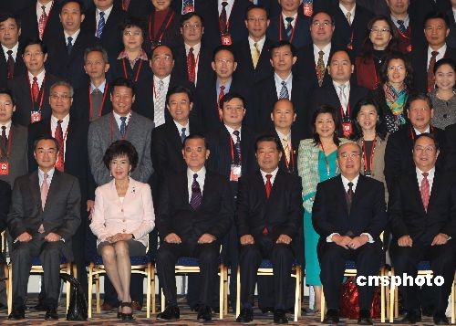 12月20日,中共中央政治局常委、全國政協主席賈慶林在上海,與出席第四屆兩岸經貿文化論壇的嘉賓們合影。中新社發 潘索菲 攝
