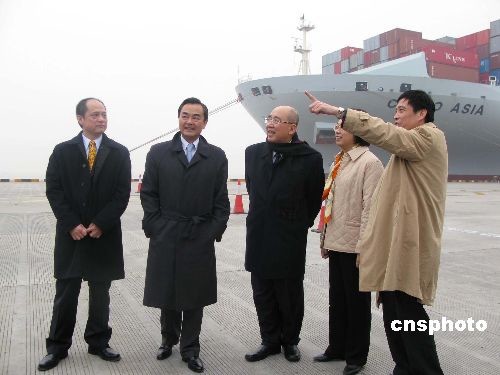 12月20日下午,中共中央臺辦主任王毅陪同中國國民黨主席吳伯雄一行前往上海洋山深水港參觀。中新社發 張子揚 攝