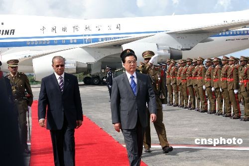 當(dāng)?shù)貢r(shí)間二月十六日下午四時(shí)許,中國(guó)國(guó)家主席胡錦濤飛抵路易港,開(kāi)始對(duì)毛里求斯進(jìn)行國(guó)事訪問(wèn),這也是他此次亞非五國(guó)友好合作之旅的最后一站。毛里求斯總理拉姆古蘭在機(jī)場(chǎng)舉行隆重儀式,熱烈歡迎胡錦濤到訪。中新社發(fā) 齊彬 攝