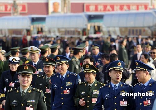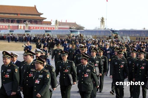 3月9日,十一屆全國人大二次會議在北京人民大會堂舉行第二次全體會議,解放軍代表團步入會場。中新社發 盛佳鵬 攝