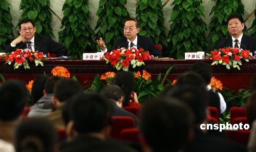 3月10日,十一屆全國人大二次會議在人民大會堂舉行記者會,工業和信息化部部長李毅中(中)、人力資源和社會保障部部長尹蔚民(右)、商務部部長陳德銘(左)就“擴內需、促就業、保增長”答記者問。中新社發 杜洋 攝