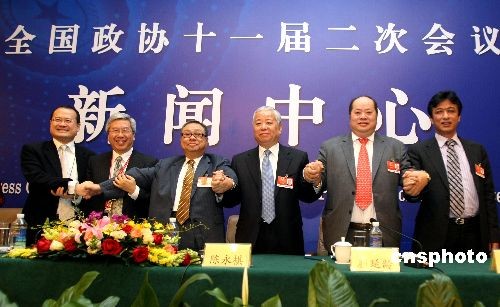 3月10日,全國政協十一屆二次會議舉行“港澳委員談如何應對全球金融危機”專題記者會,陳永棋、李家祥、張華鋒、蔡冠深、許健康、顏延齡委員回答記者提問。記者會結束后,六位港澳委員手拉手,表示共同對抗金融危機。中新社發 傅丹丹 攝