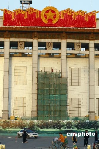 4月6日,中國國家博物館西門前罩上了綠色圍擋,工作人員正在加緊搭建上海世博會倒計時牌。據悉,該倒計時牌將于2009年5月1日上海世博會倒計時一周年之際正式亮相。全國政協常委、上海世博會執委會執行主任萬季飛在“兩會”期間表示,上海世博會將于明年5月1日開幕,在倒計時一周年之際,組委會將于今年5月1日在天安門廣場和國家博物館西門前豎立上海世博會倒計時牌,7月5日到15日將在首都博物館舉辦走進世博會大型巡展。中新社發 鄭雄增 攝