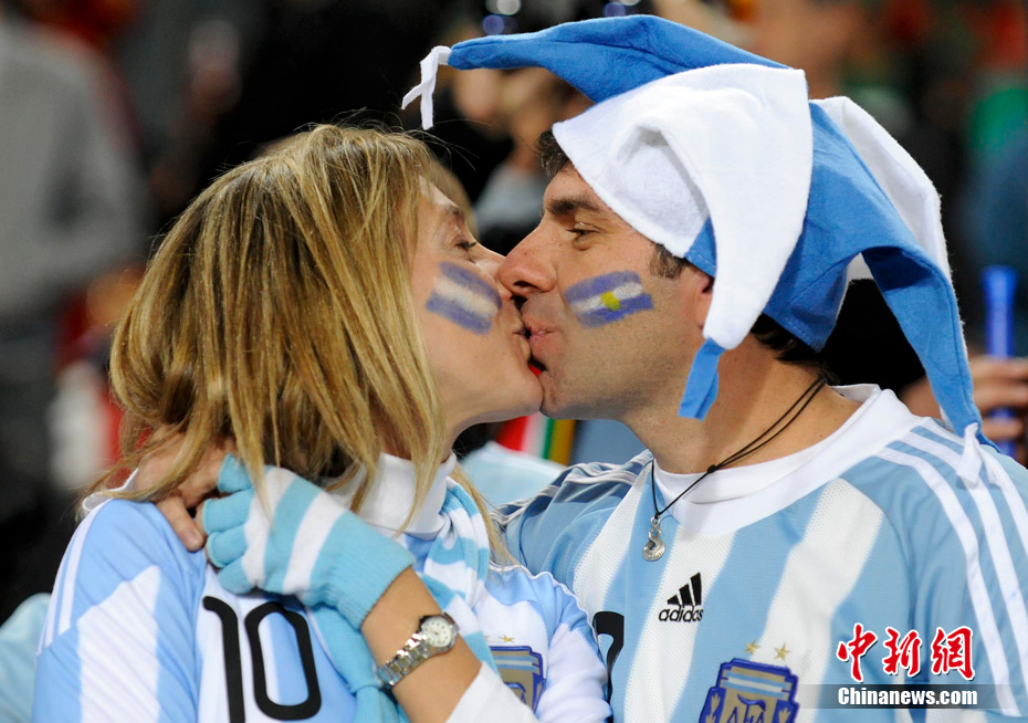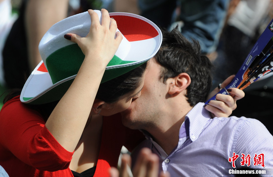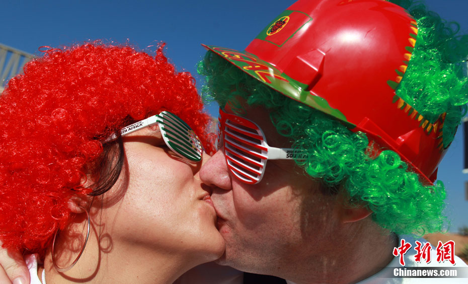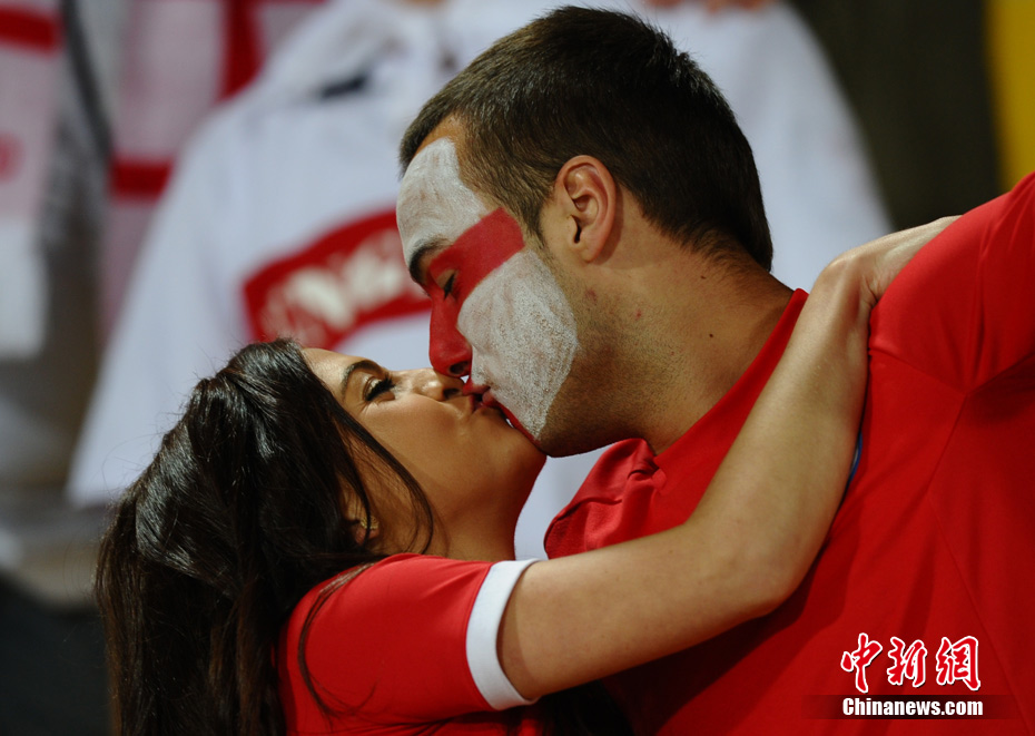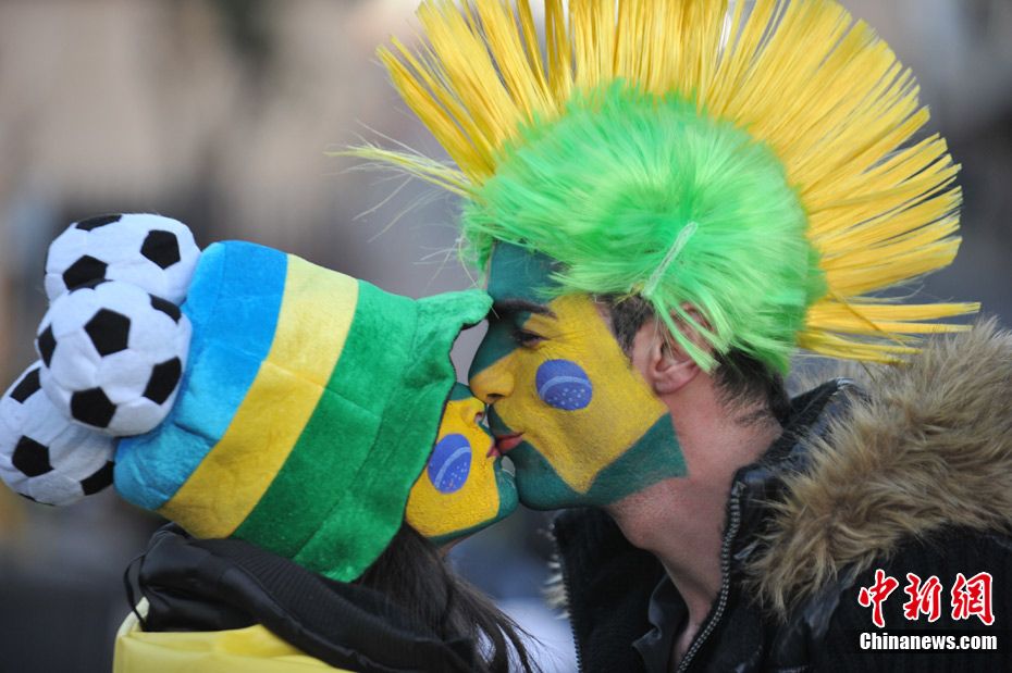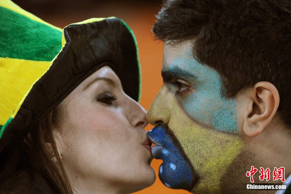 足球讓女人走開不是真理,與愛人共同享受足球之魅才是幸福?磁_上愛侶的濃情蜜意著實讓人羨慕,情到深處的深深一吻,獻給愛人,也獻給令人癡迷的世界杯。中新社記者 廖攀 攝