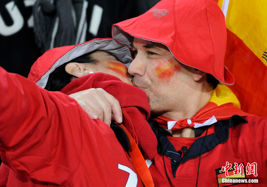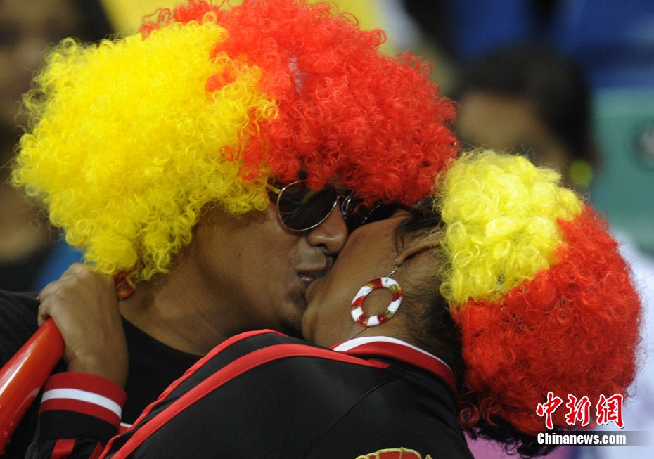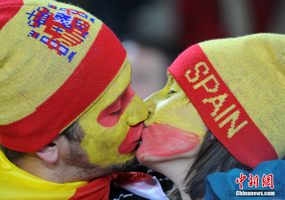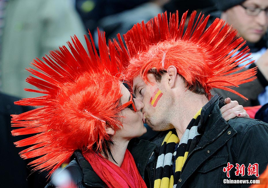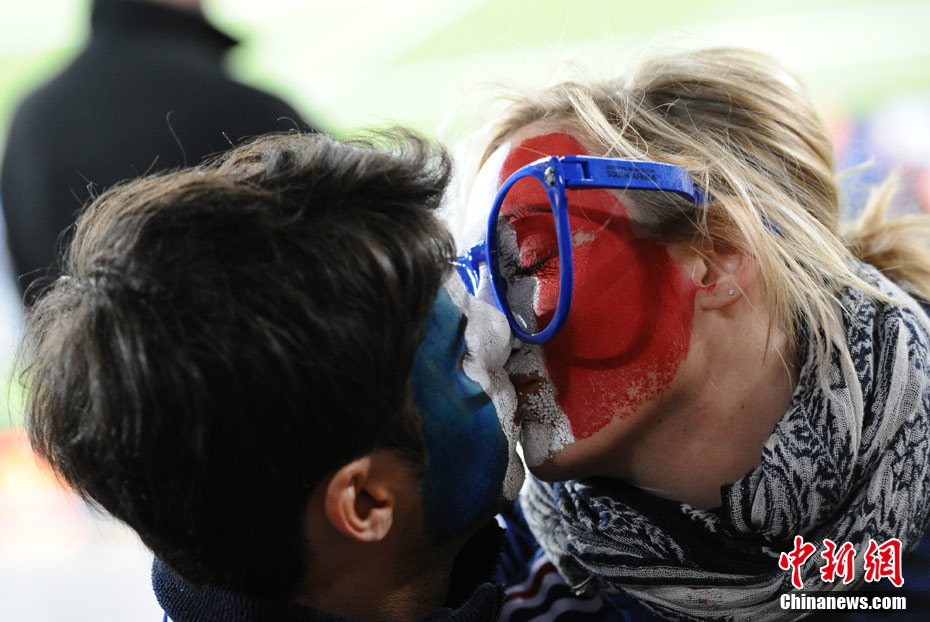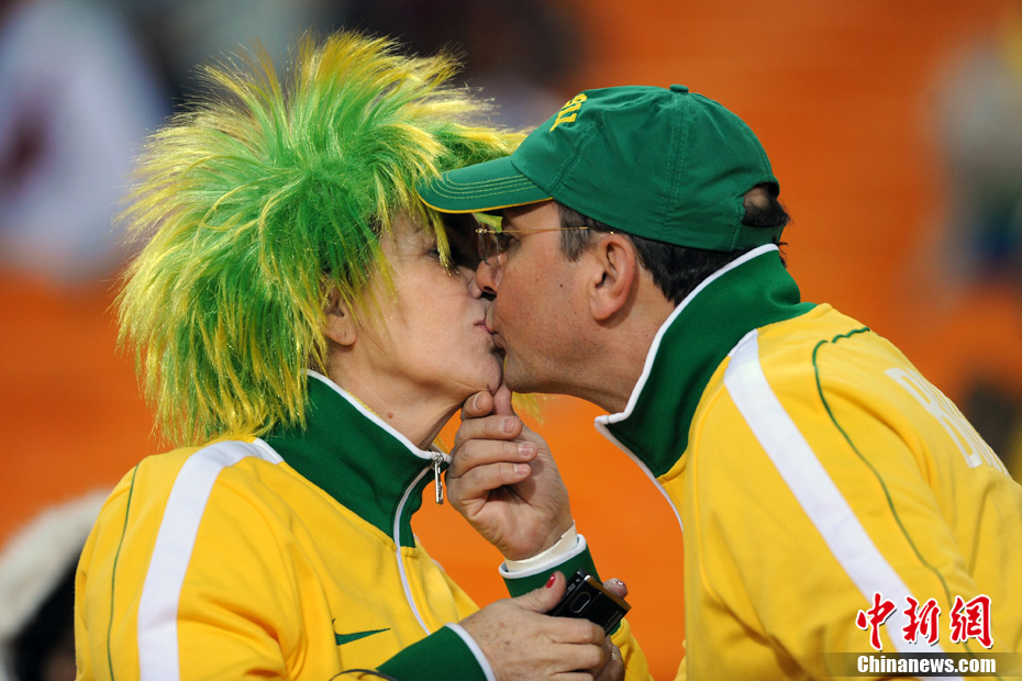 足球讓女人走開不是真理,與愛人共同享受足球之魅才是幸福?磁_上愛侶的濃情蜜意著實讓人羨慕,情到深處的深深一吻,獻給愛人,也獻給令人癡迷的世界杯。中新社記者 廖攀 攝