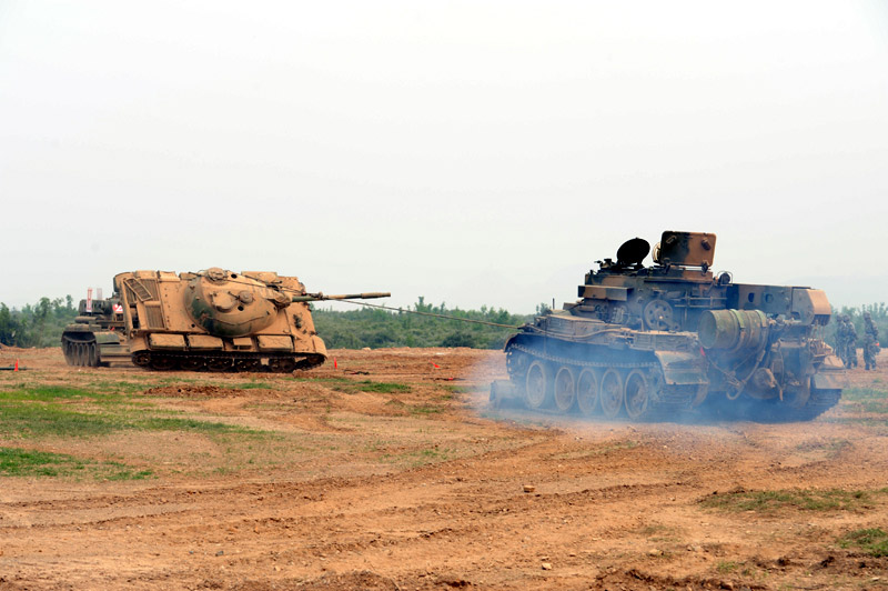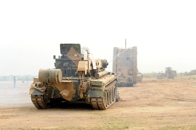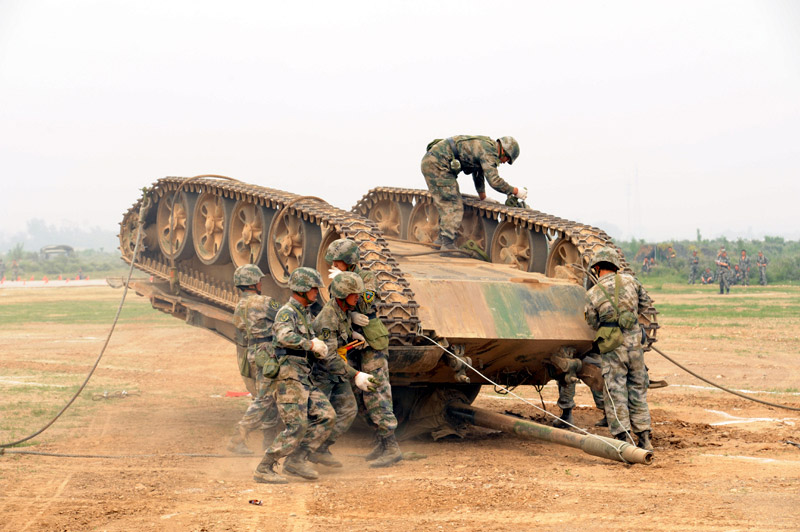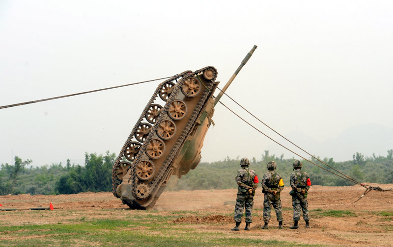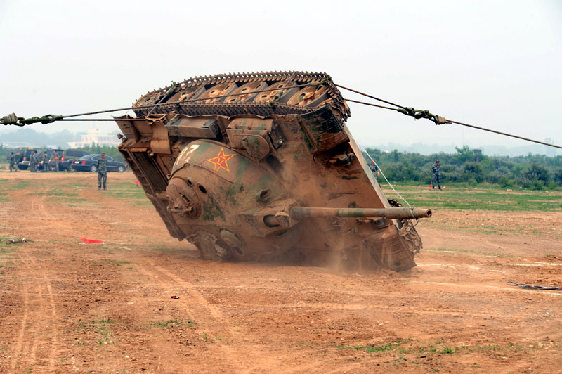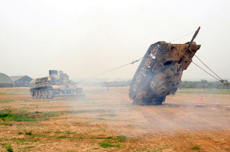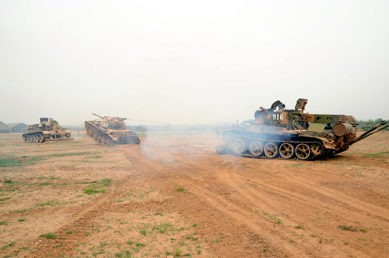 6月29日,北京軍區基礎比武進入第二天,裝甲搶救車牽引訓練坦克駛入比武現場。圖片來源:新華網 高航 攝