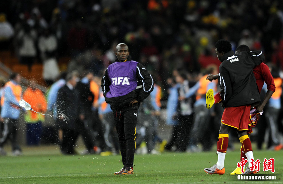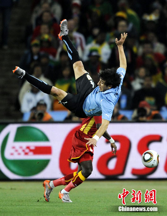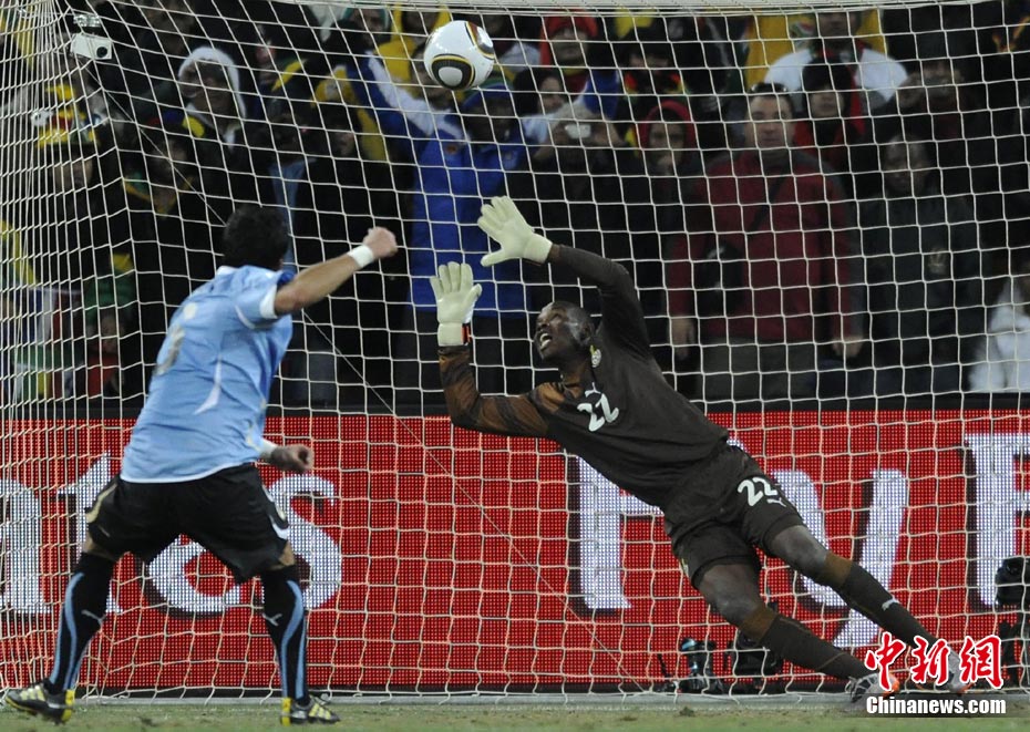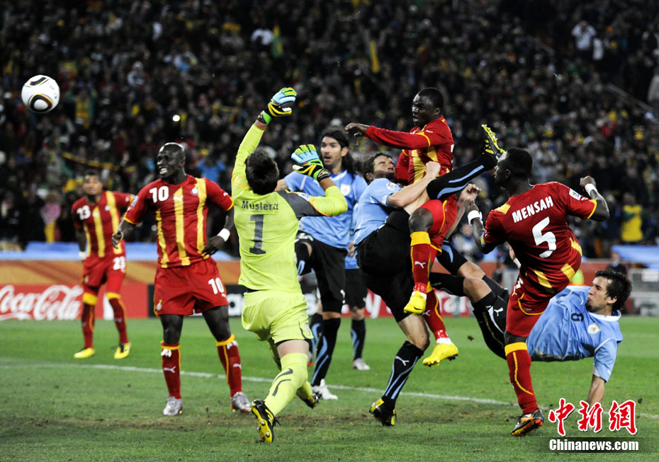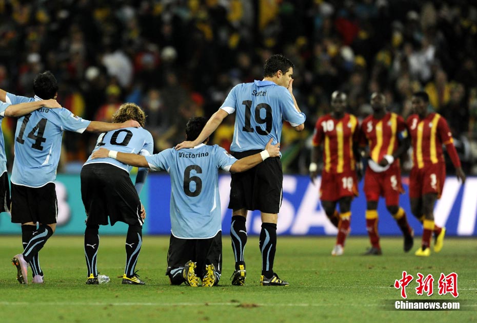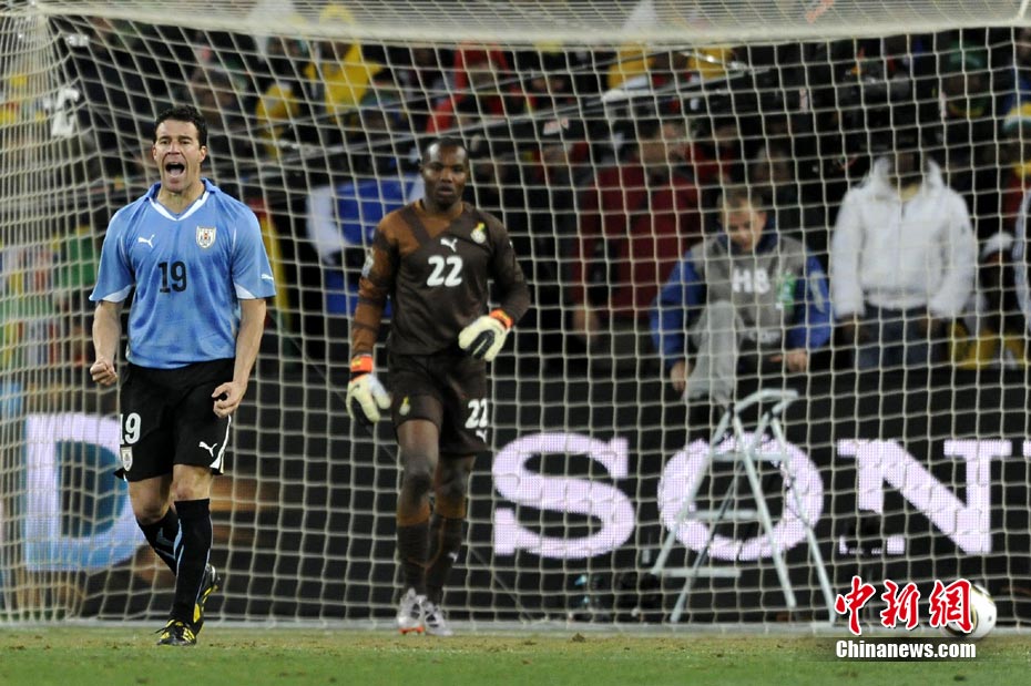 北京時(shí)間7月3日凌晨2:30,南非世界杯進(jìn)行了1/4決賽的第二場(chǎng)爭(zhēng)奪,由烏拉圭在約翰內(nèi)斯堡的足球城球場(chǎng)迎戰(zhàn)加納隊(duì)。120分鐘時(shí)間內(nèi),雙方憑借弗蘭和蒙塔里的進(jìn)球,1-1戰(zhàn)成平局。在點(diǎn)球大戰(zhàn)中,烏拉圭4-2擊敗對(duì)手,晉級(jí)半決賽。 中新社記者 廖攀 攝