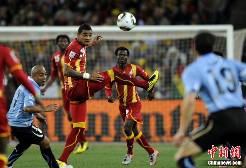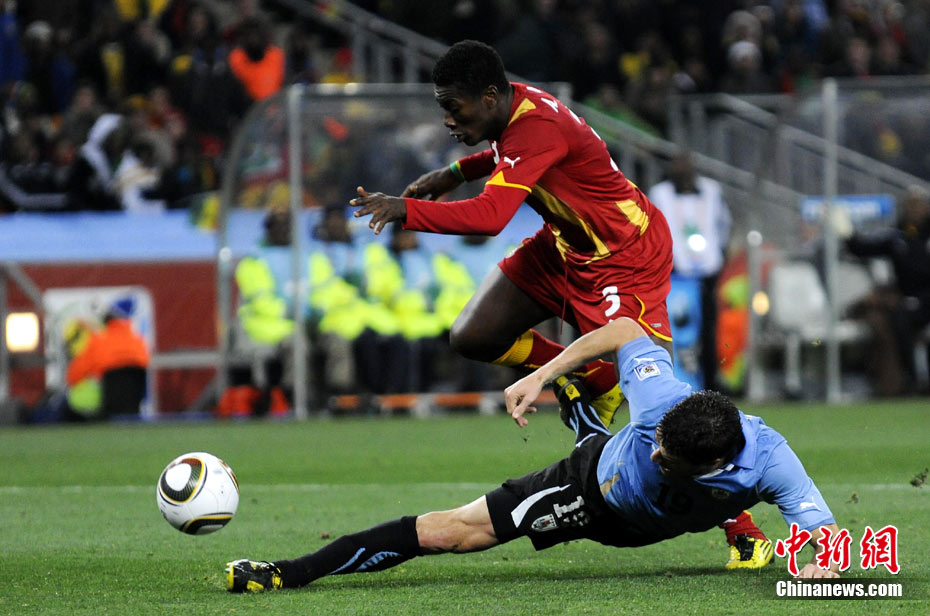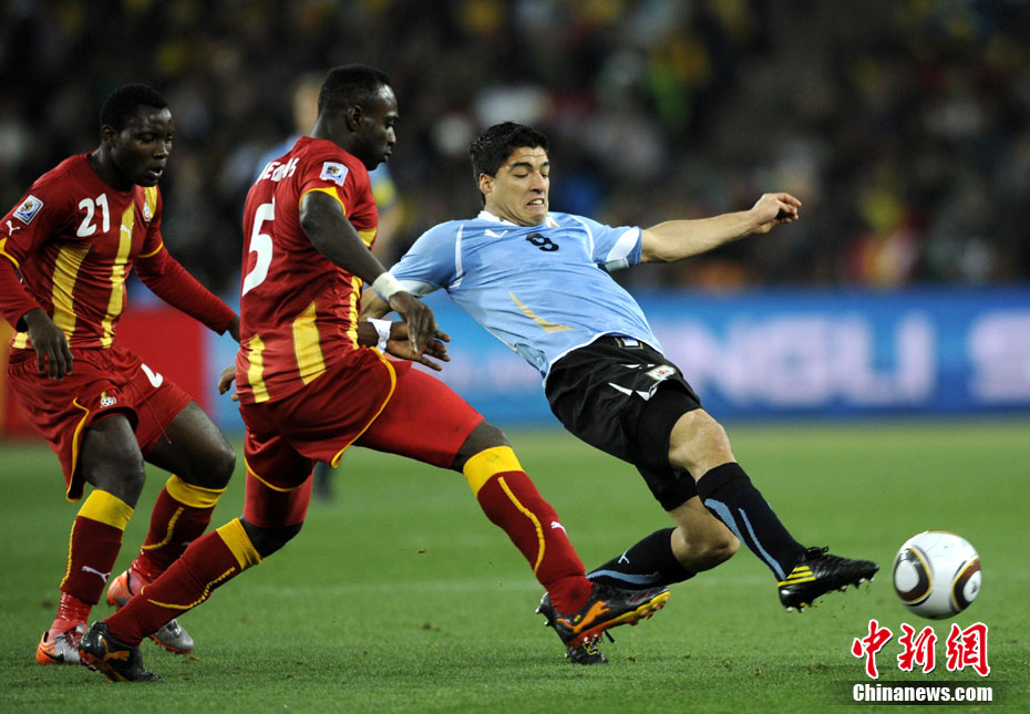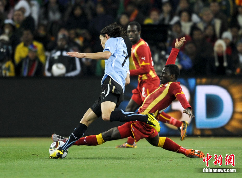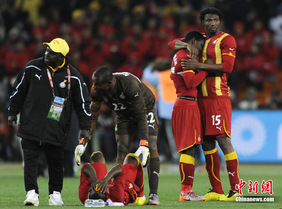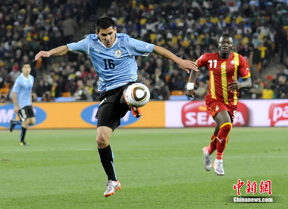 北京時(shí)間7月3日凌晨2:30,南非世界杯進(jìn)行了1/4決賽的第二場(chǎng)爭(zhēng)奪,由烏拉圭在約翰內(nèi)斯堡的足球城球場(chǎng)迎戰(zhàn)加納隊(duì)。120分鐘時(shí)間內(nèi),雙方憑借弗蘭和蒙塔里的進(jìn)球,1-1戰(zhàn)成平局。在點(diǎn)球大戰(zhàn)中,烏拉圭4-2擊敗對(duì)手,晉級(jí)半決賽。 中新社記者 廖攀 攝