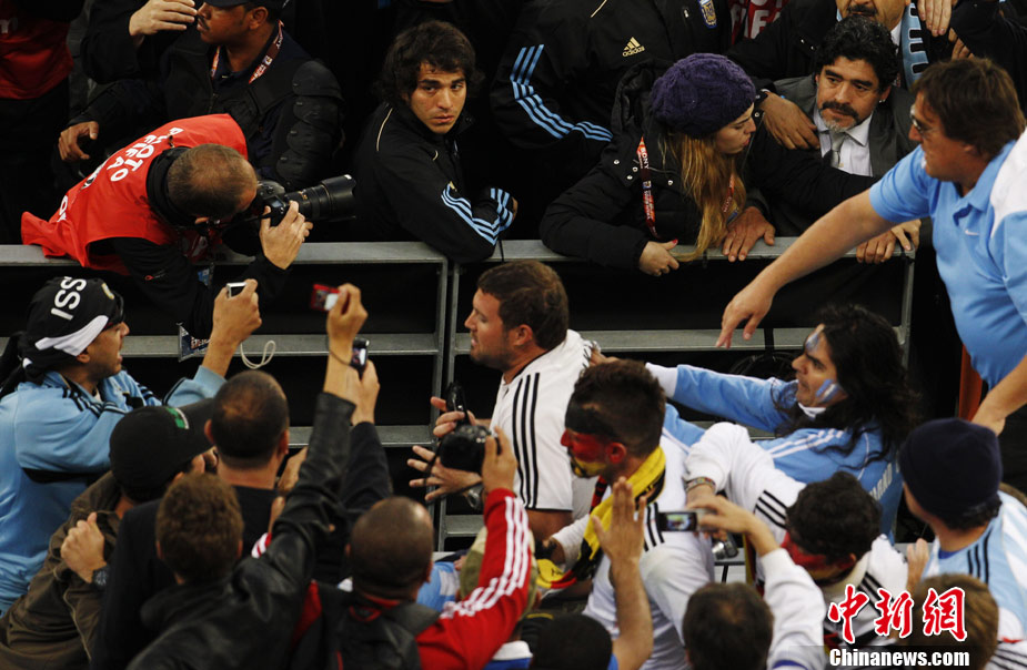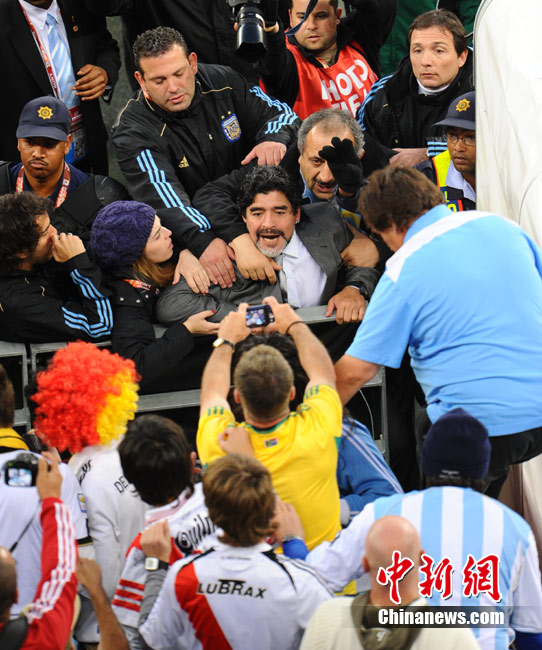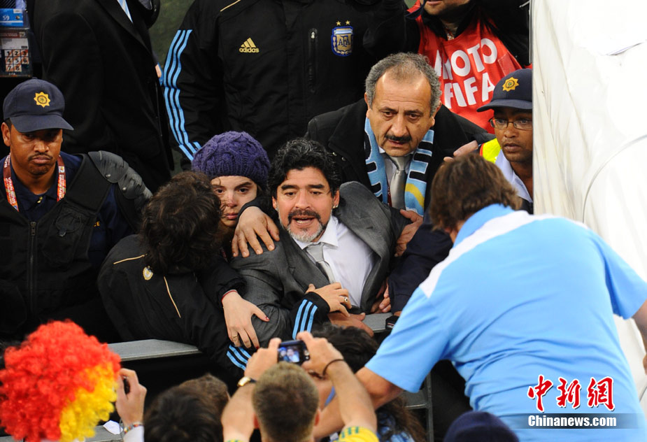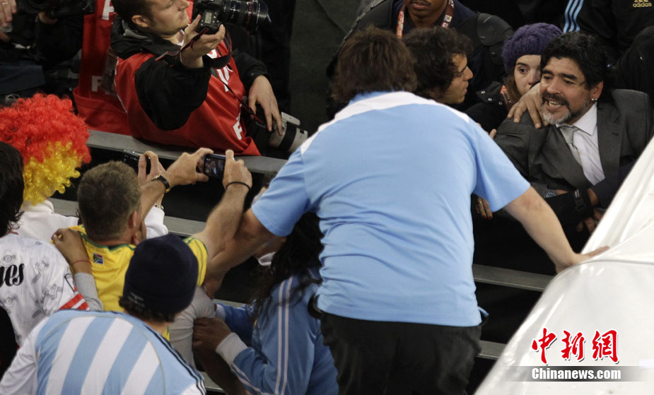 南非世界杯阿根廷與德國隊的比賽結束后,瘋狂的德國球迷對馬拉多納進行了辱罵和奚落,急脾氣的老馬轉身沖向看臺與球迷理論,他更是要爬上看臺親手教訓這些球迷。好在大女兒達爾瑪和阿根廷教練組成員及時前往制止,否則后果將不堪設想。