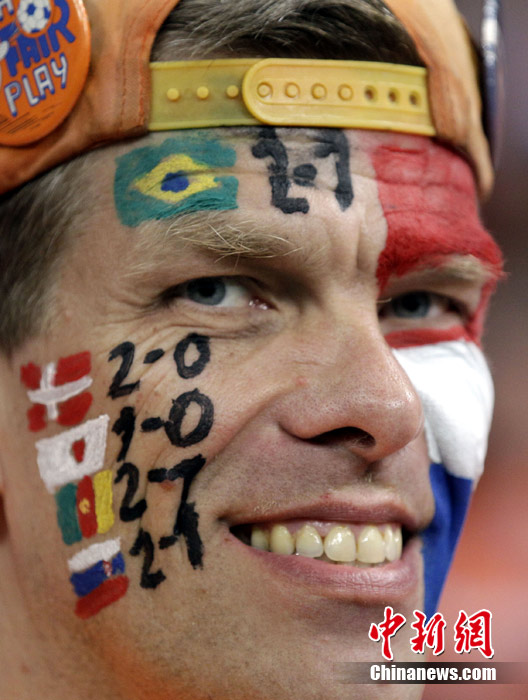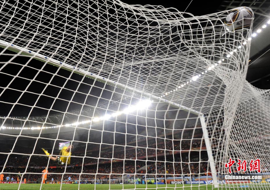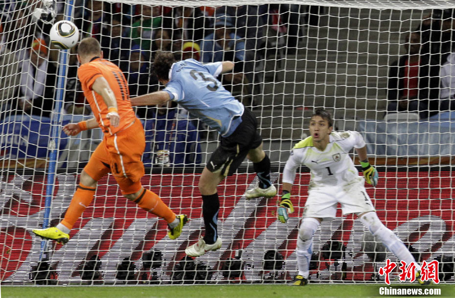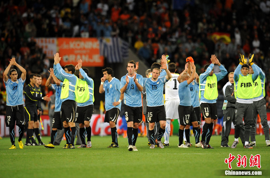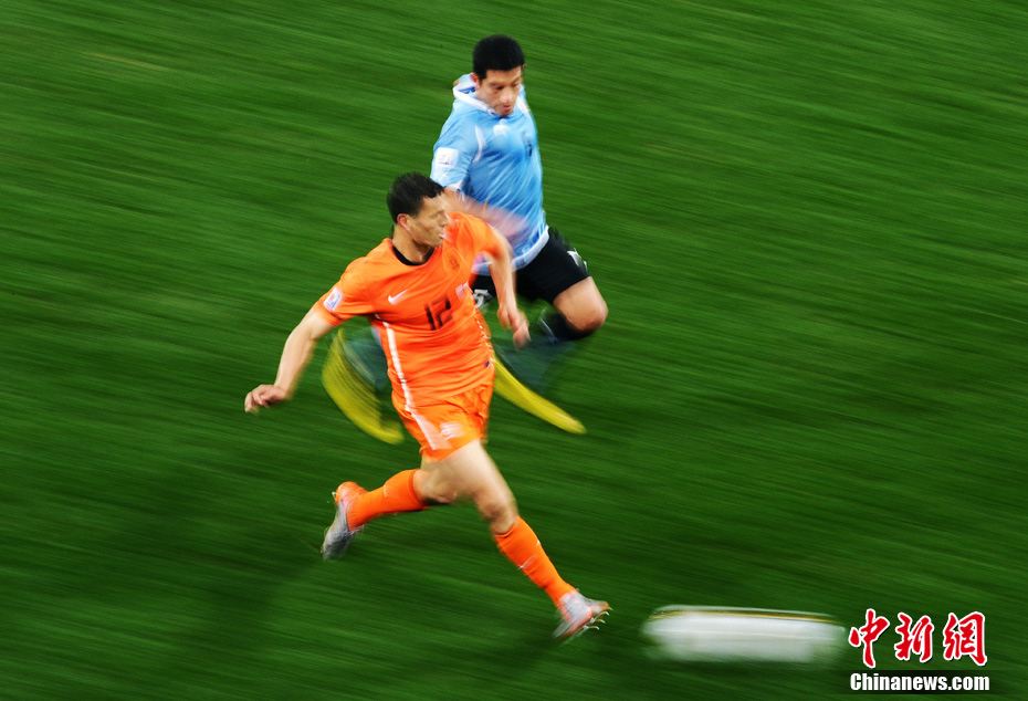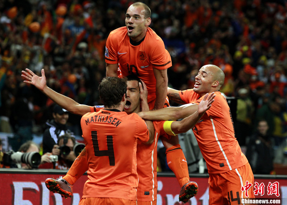 7月7日凌晨2:30,南非世界杯半決賽首場較量在開普敦綠點球場拉開戰幕,由南美老牌勁旅烏拉圭迎戰荷蘭隊。布隆克霍斯特遠射先拔頭籌,而弗蘭也通過一記遠射將比分扳平。下半場斯內德和羅本連續進球一度令荷蘭隊鎖定勝局,然而補時階段烏拉圭人的進球似乎又燃起了最后的希望,但荷蘭隊頂住了對手的瘋狂進攻,3-2擊敗烏拉圭隊,成功挺進決賽。