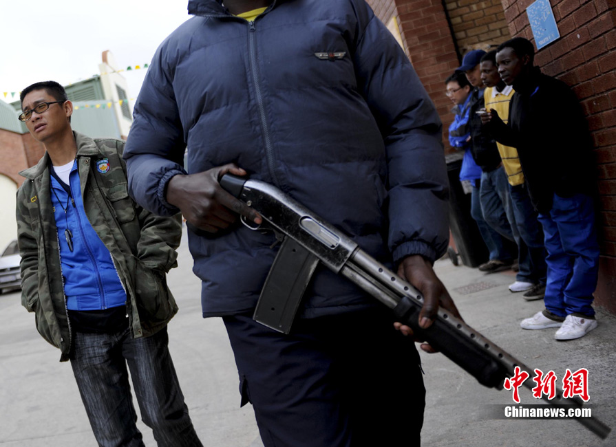 南非華人安保公司總經理謝宇航與南非當地員工持槍在約翰內斯堡中國商貿城內巡邏。約翰內斯堡被稱為全世界最危險的城市之一。世界杯期間,南非的這種保安公司不僅受雇為球隊做保鏢,而且在警力不足的情況下,許多保安公司受雇于警方,成為保衛世界杯安全的一支重要力量。而南非華人安保公司也是其中之一,他們的主要服務對象是位于約翰內斯堡核心城區的中國商貿城。中新社發 廖攀 攝
