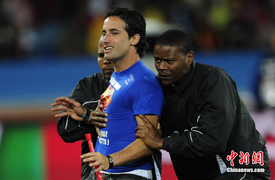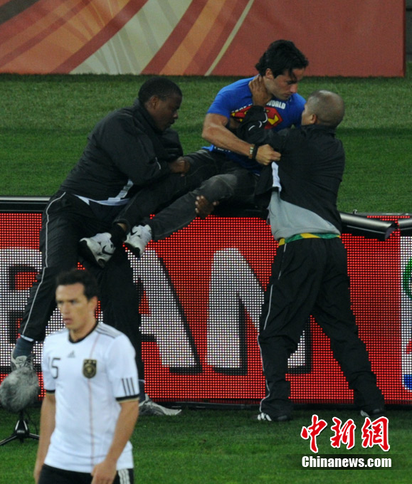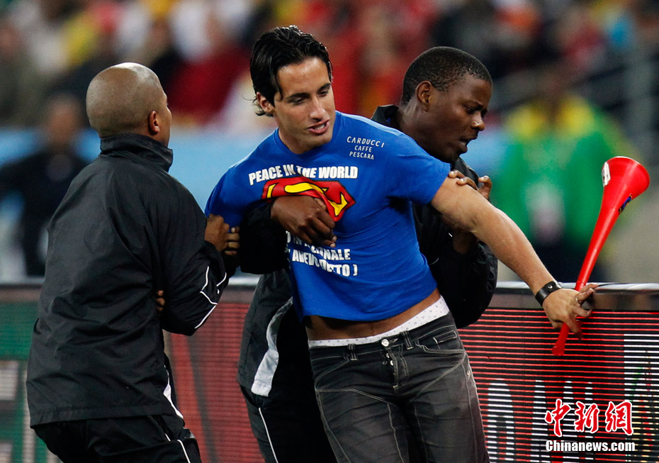 西班牙隊和德國隊激戰(zhàn)正酣時。一名球迷身穿超人背心突然闖進球場,此時雙方的比賽短暫地暫停了一會兒,球迷被保安推出了球場。后經有關部門證實,這是一名意大利球迷。