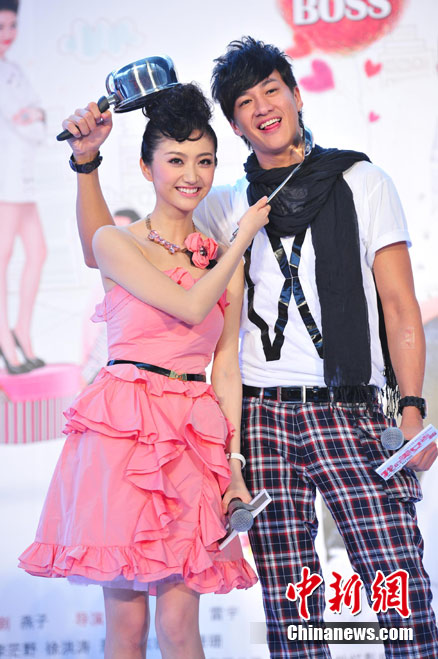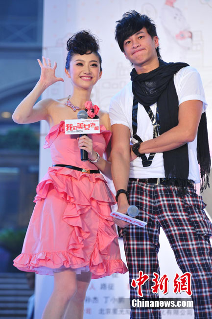 7月15日,時尚愛情喜劇電影《我的美女老板》在北京舉行了盛大發布會,主演景甜、何潤東、包小柏、吳辰君閃亮出席。景甜與何潤東在發布會上表現活潑,二人不僅別出心裁地騎摩托登場大秀甜蜜,還現場上演吻戲、搞笑十連拍,甚至帶上拳擊手套“拳腳相加”。中新社記者 李學仕 攝