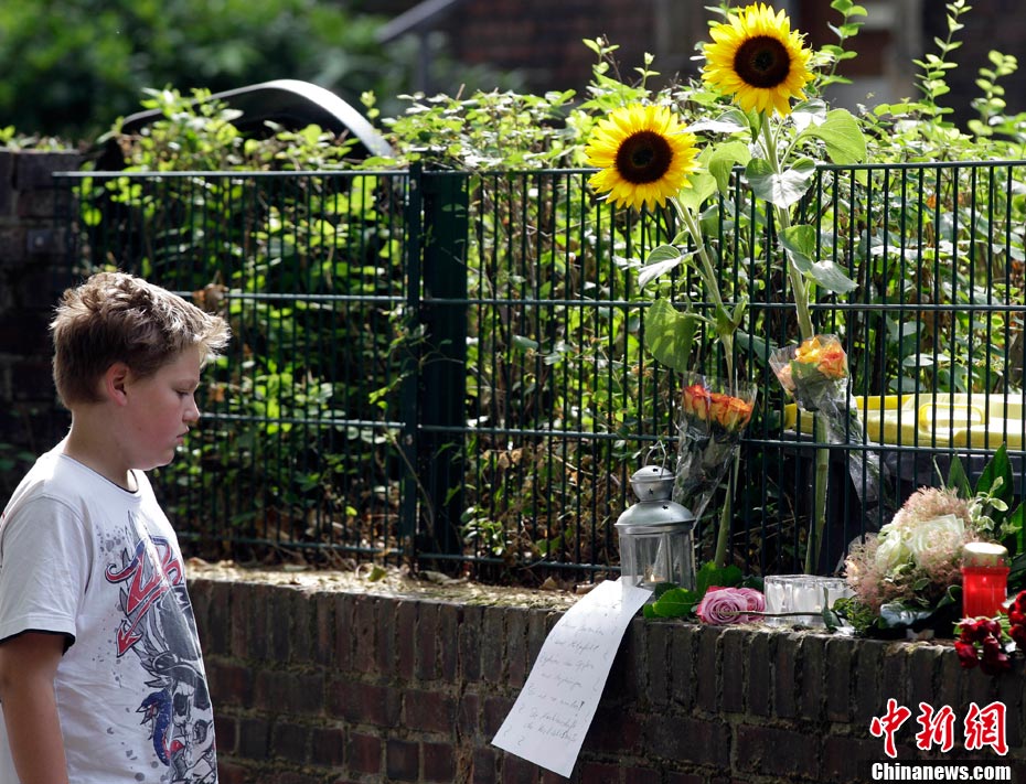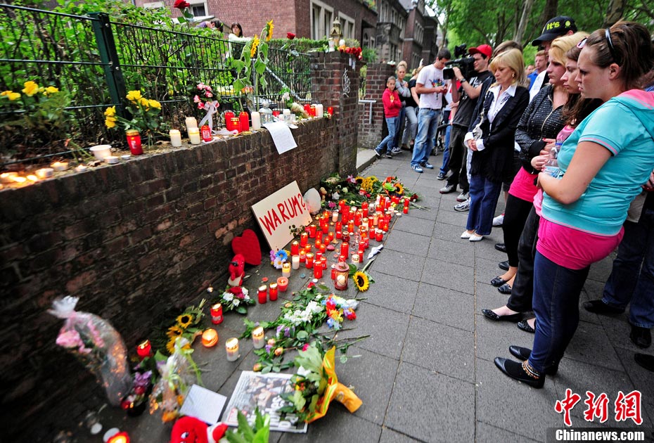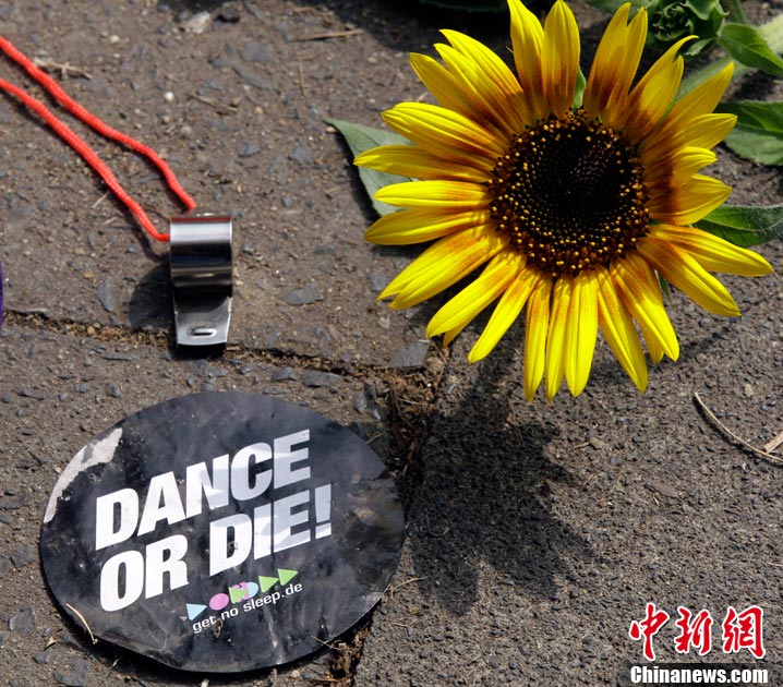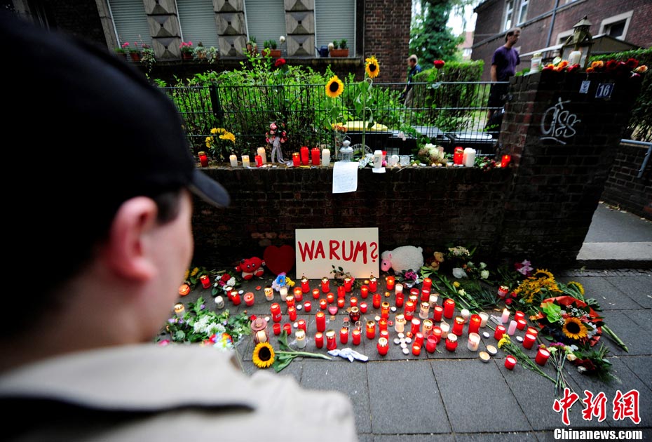 當地時間7月25日,德國西部杜伊斯堡街頭,民眾為遇難者獻上鮮花和蠟燭表示哀悼。牌子上的德語寫著“為什么”。