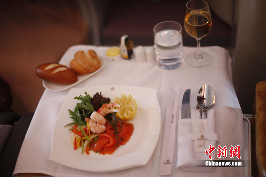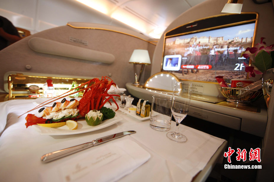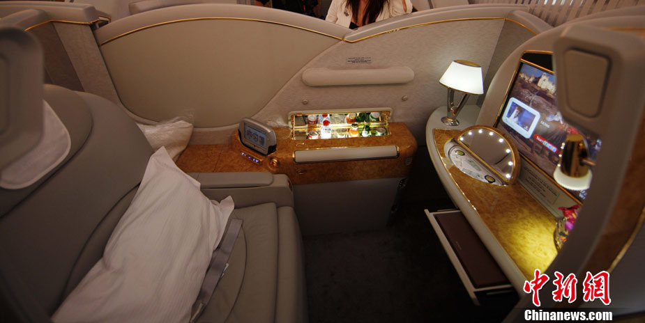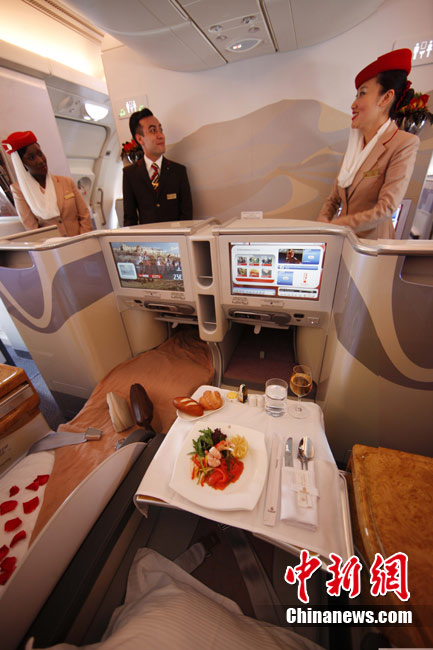 阿航A380 客機(jī)頭等艙內(nèi)共有14個(gè)私人套間,設(shè)有兩間設(shè)備齊全的淋浴房,帶按摩功能的座椅可平躺成床。頭等艙和商務(wù)艙乘客還能享受如私人會(huì)所般、提供冷熱小點(diǎn)和酒品飲料的機(jī)上酒廊社交區(qū)。商務(wù)艙的座椅可放平成2米長(zhǎng)的床,而經(jīng)濟(jì)艙的座椅可以傾斜多達(dá)33英寸,讓乘客自由舒展身體。所有艙位的乘客都可以享用阿航多達(dá)1200個(gè)頻道的數(shù)碼寬屏機(jī)上娛樂(lè)系統(tǒng),該系統(tǒng)提供空中娛樂(lè)節(jié)目。圖為阿聯(lián)酋航空空客A380上的空姐。中新社記者 盛佳鵬 攝