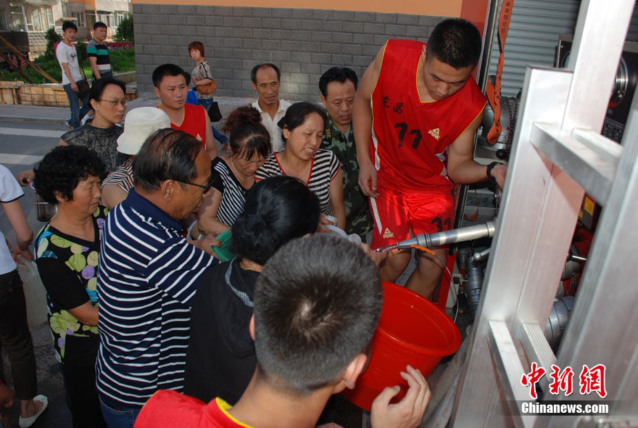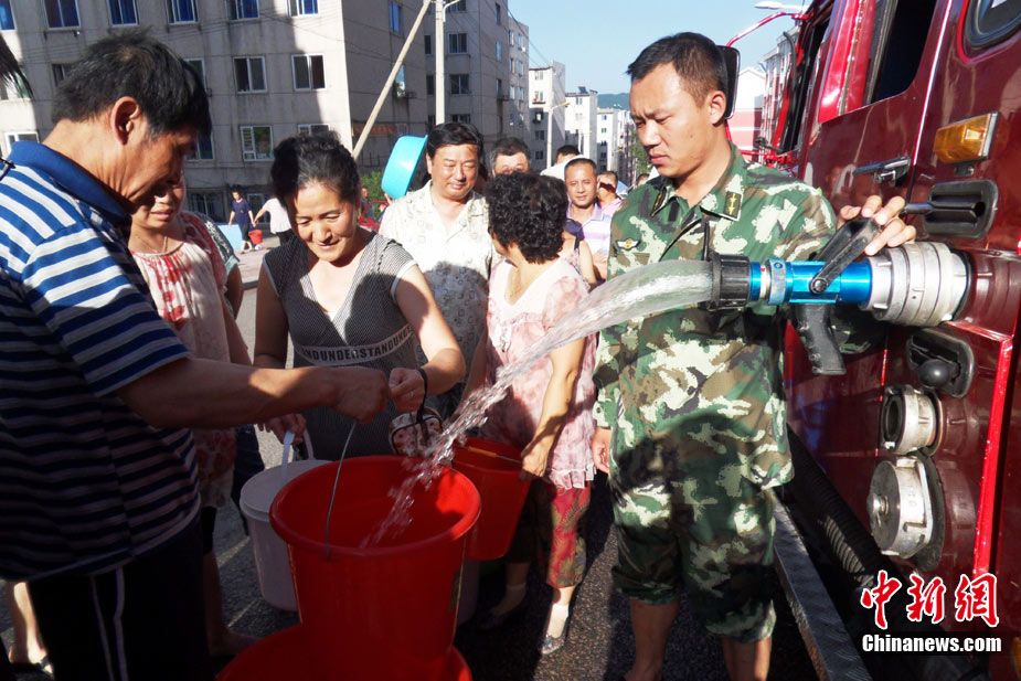 從7月31日吉林通化市內全部供水管線被洪水沖毀到現在,33萬居民斷水時間已經超過60小時。 8月3日通化市派出消防車輛給居民運送生活用水的工作仍將繼續,時間有望從早5點到晚六點延長到晚8點,送水量也不會少于180臺次、1700噸水。同時,當地衛生防疫部門對使用自用水的飯店進行了嚴格監督、檢查和登記,目前,沒有發現水質問題,也沒有食物中毒現象發生。中新社發 王孝偉 攝 來源:CNSPHOTO
