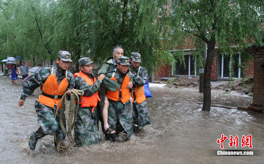 28日以來的一場暴雨讓吉林省多個地區(qū)遭遇罕見洪災(zāi),此后對災(zāi)區(qū)的救援緊張進(jìn)行。目前在永吉縣口前鎮(zhèn),已有部分商戶恢復(fù)營業(yè)。圖為在重災(zāi)區(qū)永吉縣,士兵將一名老婦轉(zhuǎn)移到安全地帶。中新社記者 張杰 攝